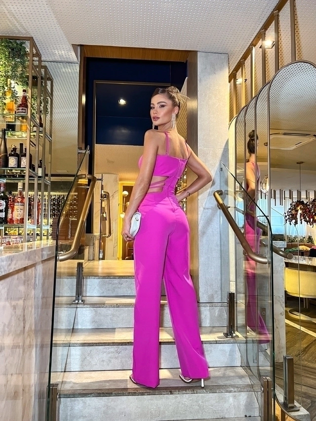 Macacão shape reto, decote reto com elástico e alça deslocada, detalhe fashionista de recortes de viés na região da cintura, bolso faca e zíper costas.